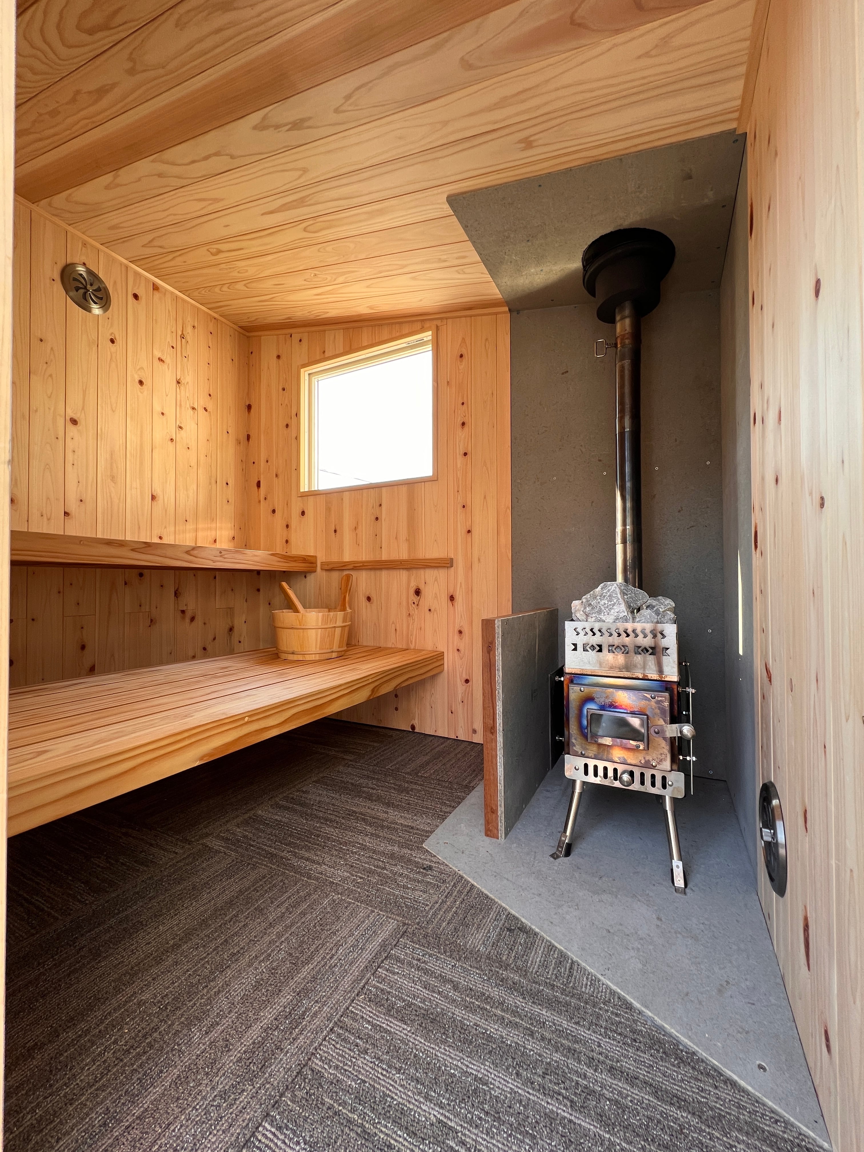 サウナの本場フィンランドを旅して体感した心地良さを再現し、自社工場で組んだ丈夫な鉄骨フレームに美作産の檜と杉を組み合わせた、純美作産のサウナです。